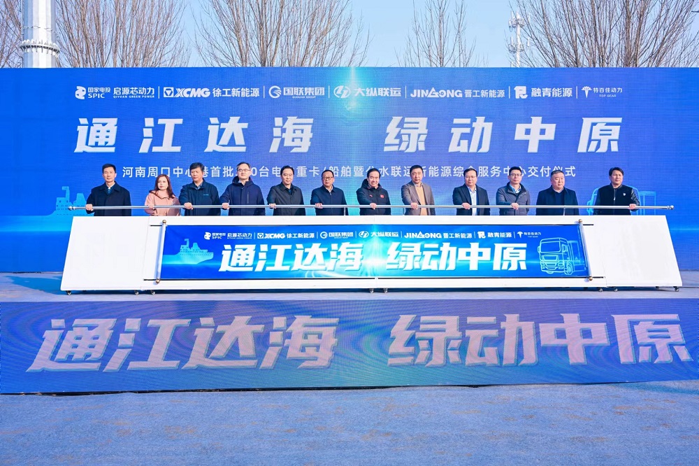 1月9日,首批300台新能源重卡/船舶暨公水联运新能源综合服务中心交付仪式在河南省周口中心港盛大举行。兰钧新能源科技有限公司CEO钟开富博士一行受邀参加本次仪式并与参会领导、嘉宾上台共同推杆。在全体参会代表的见证下,300台新能源重卡正式投入运营。