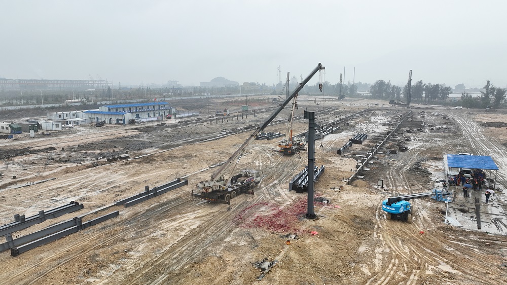 青拓重工总装车间厂房钢结构首支立柱正式安装